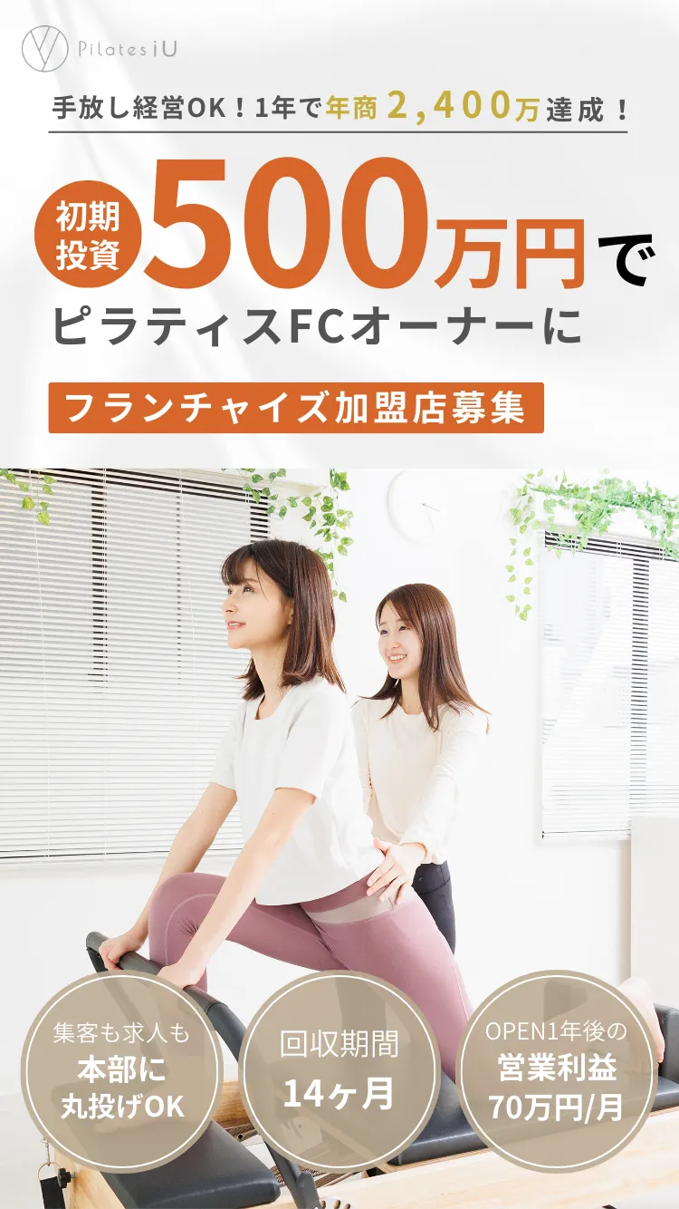 Pilates iU(アイユー)は、初期費用500万円で始められる、投資型に特化したピラティススタジオフランチャイズを展開しています。